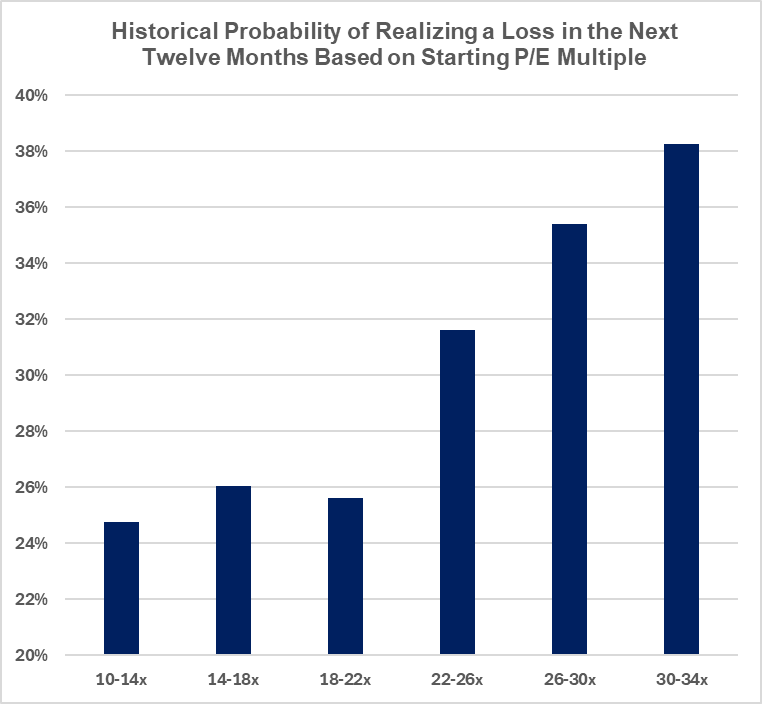 To illustrate this, we analyzed daily returns since 1990 for the MSCI World Index. When valuations were modest (around 10–20x), the historical likelihood of a negative 12-month return was about one in four. When starting multiples rose to 20–30x, that risk increased to roughly one in three.