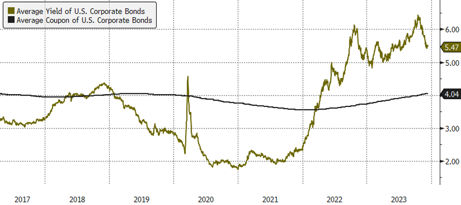 Chart 4: Corporate borrowers are facing years of rising interest costs as maturing bonds are refinanced with coupons that pay current substantially higher yields