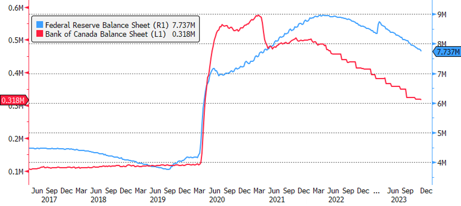 Chart 2: The Fed (blue, right axis) has unwound ~$1.3 trillion in quantitative easing stimulus while the BoC (red, left axis) has unwound $250 billion, with more tightening expected from both