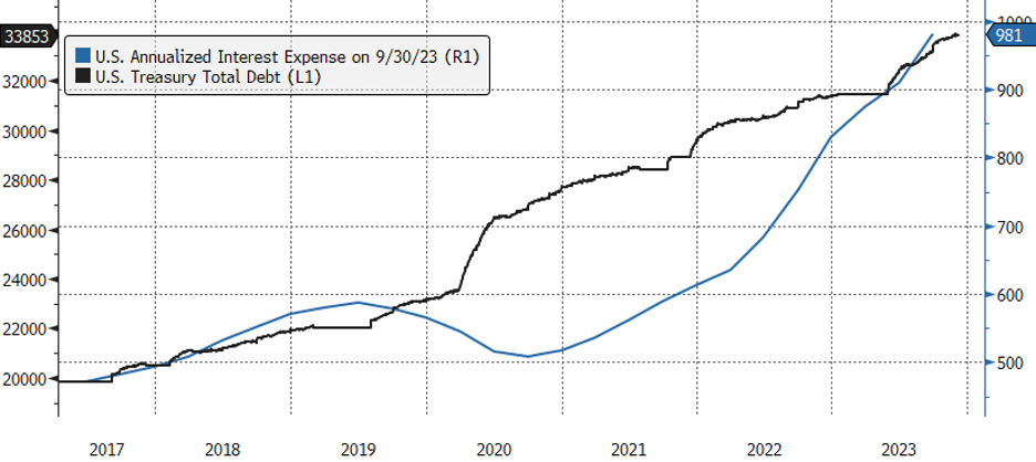 Chart 3: U.S. federal interest expense has nearly doubled since 2020, while total U.S. federal debt is approaching $34 trillion