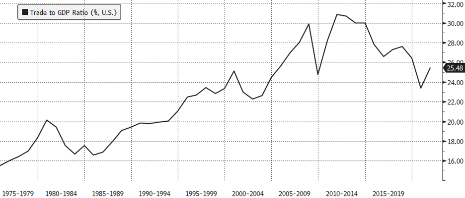 Chart 5: After rising consistently for decades, U.S. trade as a % of GDP has declined meaningfully as globalization in the western world has slowed and, in some cases, reversed