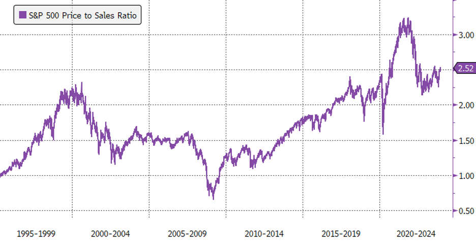 Chart 6: Investors today must pay more per dollar of revenue for the average S&P 500 company than at the height of the Dotcom bubble – an indication of stretched equity valuations