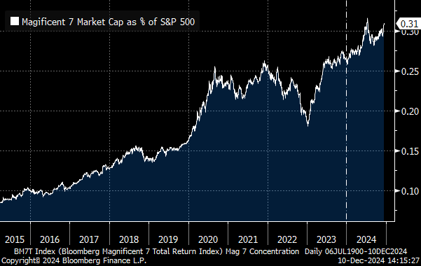 However, that performance was by no means enjoyed equally across the entire market; after pulling back in 2022, the so-called “Magnificent 7” (Amazon, Google, Meta, Apple, Nvidia, Tesla, Microsoft) now make up nearly a third of the entire S&P 500’s market cap. We view this degree of concentration as decidedly unhealthy.