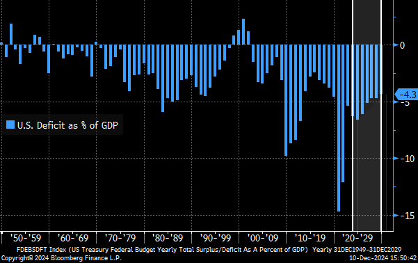 The shaded area below are forecasts that project the deficit will decline from ~7% to ~4% by the end of the decade, assuming no new spending or tax cuts. We see this as a highly unlikely outcome, and do not anticipate deficits reducing to this extent. Even if they did, a deficit of 4% of GDP is still very high.