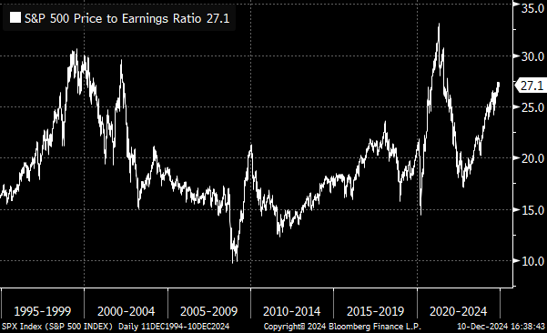 Going into 2025, valuations are indeed very high. Stock markets have priced in plenty of good news this year, and the bar to realize another year of strong performance has been raised even higher. There are many ways to measure how “cheap” or “expensive” stocks are, but the most universal is price-to-earnings. This represents how many dollars you’d need to pay for each dollar of net profit for a given company (or index in this case). Historically the U.S. market has averaged around 18x for P/E, with 13x being seen as quite cheap and 23x as quite expensive.