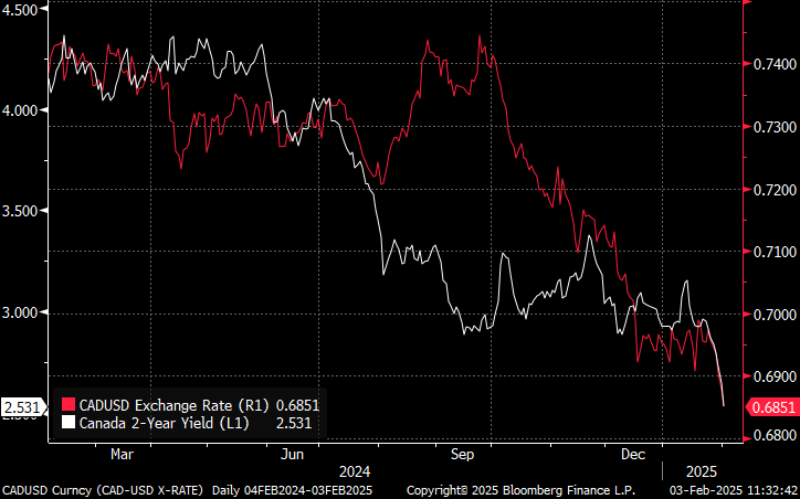 It's also a lesson in the importance of being proactive rather than reactive – we’ve spent a great deal of time thinking about our exposure to Trump and tariffs even before he was elected. Our conclusion during this process was that the US dollar would offer good protection against tariffs, and that our favorite sector – Canadian energy producers – is well positioned to prosper even if Trump were to tax the critically important energy exports Canada provides. With that in mind, we’ve been gradually increasing USD exposure in recent months (either directly or indirectly), and we’re just as bullish on Canadian energy as we were three months ago. We’ve also added a bit of duration in bonds, which we expect to act as a further cushion in the event of a protracted trade war. So far, both Canadian bonds and the US dollar have reacted in a way that has mitigated much of the impact, and we expect that to continue if the trade relationship deteriorates further. The chart below shows how the loonie and Canadian bond yields have declined in lockstep in recent weeks (falling yields increase the market value of existing bonds).