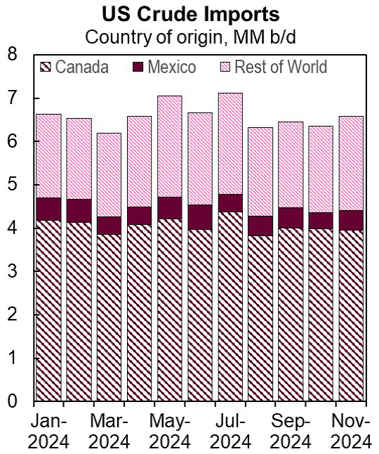 Ultimately our view is that a 10% tariff on Canadian oil will make US refinery feedstock 10% more expensive, which in turn will be a cost born by the US consumer. For better or worse, the North American energy landscape is highly integrated, and it’s simply not feasible to cut off Canadian energy without incurring significant knock-on effects for American consumers.