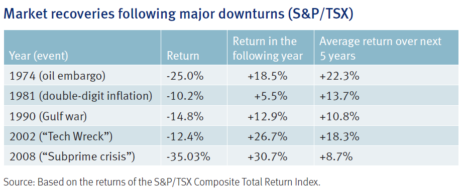 Unquestionably, stock market downturns can be painful, especially when you’re in the middle of one. It’s not always easy, but it’s important to remember that downturns have happened before – and will happen again – and that historically, as the table above shows, the markets have always recovered and reached new highs.