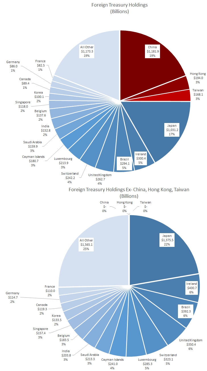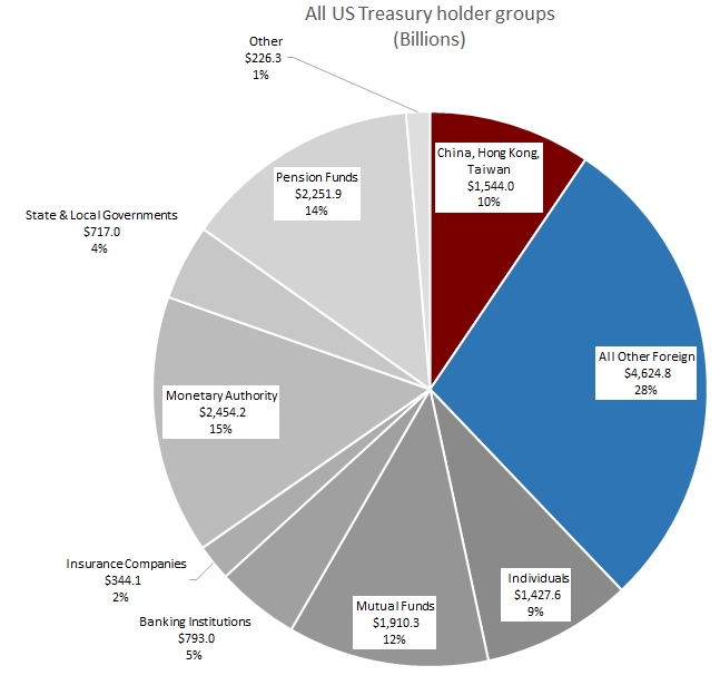 Don’t forget, that’s just the foreign holders, who currently make up 38% of the total owners. Most of the Treasuries are owned domestically. Mainland China is 7.2% of total ownership (all of China is 10%). At the right price, banks, insurance companies, mutual funds, and pension funds—as well as individuals to a lesser extent—would probably be happy to increase their Treasury holdings, especially given a more productive [higher] yield.