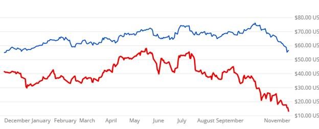 Chart: Western Intermediate (blue) and Western Canadian Select (red) oil prices