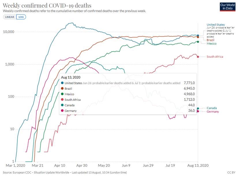Global equity markets crept higher this week despite the lack of progress on a U.S. stimulus package. I argue that while the U.S. has been one of the best performing markets so far during this pandemic, the market dominance has been almost exclusive to the multinational tech businesses. A further U.S. stimulus package is less valuable to them than general global pandemic recovery would be. This week, I’ll address the dichotomy that has emerged on the virus front between the U.S. and much of the rest of the world, and the implications of the upcoming U.S. elections now that Senator Kamala Harris has been announced as the running mate alongside Joe Biden on the Democratic ticket. I’ll also touch on some reflections on the market’s resilience of late.