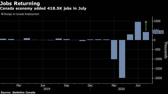 Canada is far from “back,” but we’ve seen unprecedented job gains over the past few months as provinces have begun to open back up. After losing 3 million jobs in March and April, Canada added back 1.7 million in May, June, and July, including the just-printed 418,500 last month. That is 55% of the jobs lost, a far faster recovery than the U.S. so far seen (adding back only 42% over the same period). This doesn’t mean the recovery in jobs will proceed apace, and the argument can certainly be made that there will be diminishing returns as the remaining lost jobs are concentrated in industries still reeling from the effects of COVID-19.