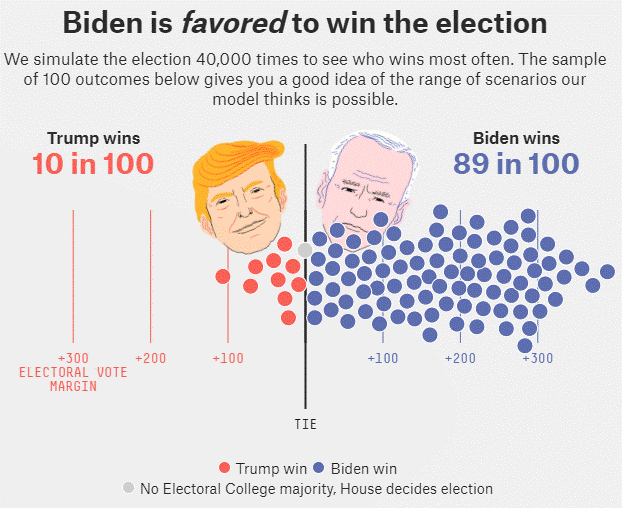 Nate Silver has updated the 538 Presidential Forecast to 89% probability for Biden, 10% for Trump. Similar polling has been put forward by the Economist, Fox New, and others.