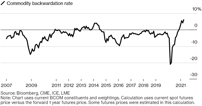 Outside of the stock world, hard assets like real estate, commodities (particularly gold, copper, and oil), and—who knows—maybe even cryptocurrencies are helped because they inflate with everything else. Backwardation—the premium for delivery of a commodity today versus delivery in the future—is as high as it’s been since 2007. It’s called ‘backwardation’ because it’s usually more expensive to buy something for future delivery. The carrying cost of holding an inventory usually comes into play. Backwardation happens when there is urgent demand for a commodity today.