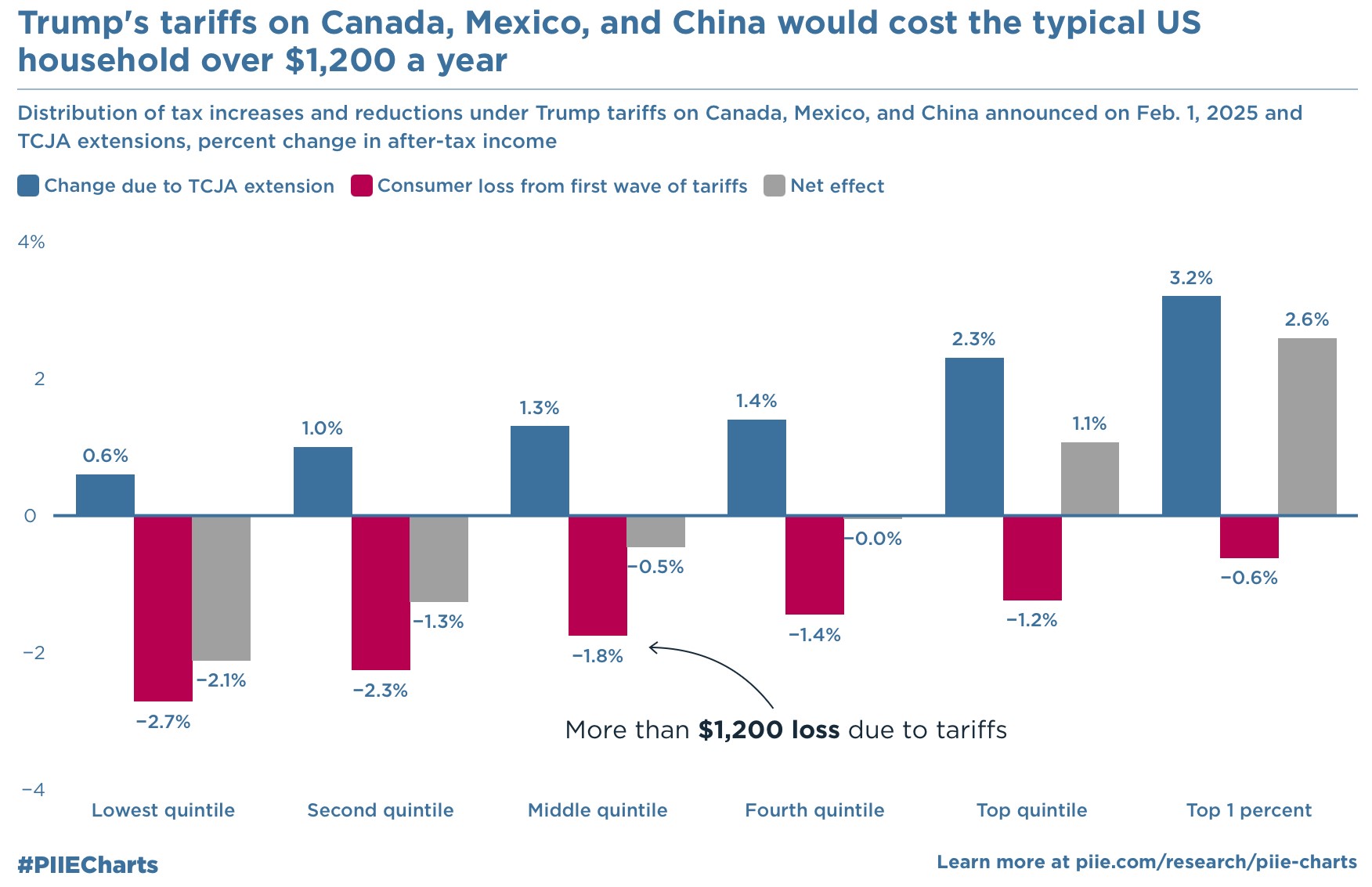 In the U.S., these tariffs are shaping up as a double-edged sword. Yes, some industries (steelmakers, domestic solar manufacturers) might cheer a little protection from foreign competition, but higher costs could quickly bite consumers and businesses elsewhere. Retailers, tech firms, and manufacturers reliant on global supply chains could face price hikes and profit squeezes. Not to mention consumers. The Peterson Institute has researched the expected effect of today’s tariffs on U.S. consumers, and it’s not a pretty picture, costing a middle quintile family an extra $1,200 per year.