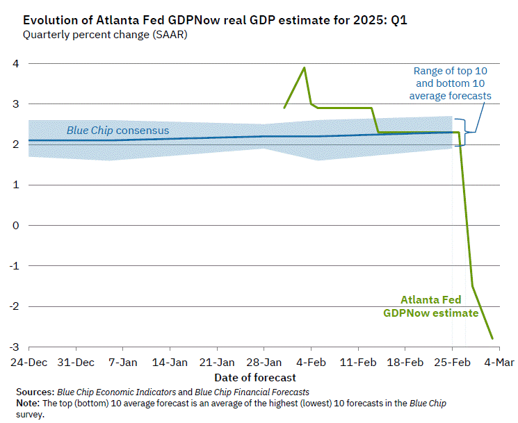 Beyond just rhetoric, this sets the stage for heightened volatility across global markets. Supply chains are tense, investors are jittery, and companies are dusting off their trade war playbooks. Add to this that the Atlanta Federal Reserve just put out its Q1 2025 growth estimate at a whopping minus -2.8% yesterday--a shocking reversal from the +3.9% is was forecasting prior to the tariff talks. The Volatility Index (“the VIX”), a measure of the ups-and-downs of the market, is up 54% since it bottomed just two weeks ago.