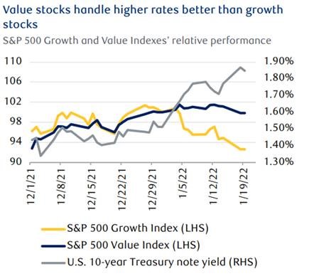 U.S. stocks continued their January slide during the holiday-shortened week as higher interest rates upset equities. Not all sectors were impacted equally; growth stocks, led by the higher-valued Technology sector, bore the brunt of the selloff while value sectors trod water (see chart). The downdraft tipped the tech-heavy Nasdaq Index into official correction territory, after it logged a 10% decline from its Nov. 19, 2021 high during the week.