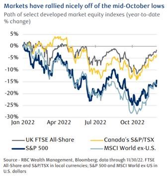 The S&P 500 has rallied 14.1 percent since mid-October, and Canada’s S&P/TSX have bounced 12.3 percent. As a result, the S&P 500 is down “only” 14.6 percent year to date compared to being down 25 percent at its worst point (see chart below).