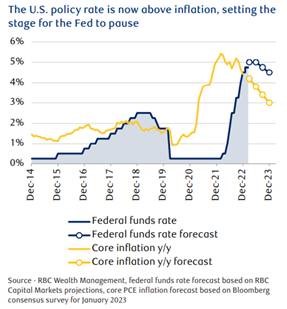 At his post-meeting press conference, Fed Chair Jerome Powell noted early signs that “disinflationary pressures” are beginning to take hold; in our view, this could lay the foundation for the Fed to begin lowering its inflation forecasts when policymakers next update their economic projections at the March meeting—and, as a result, its rate hike forecasts as well.