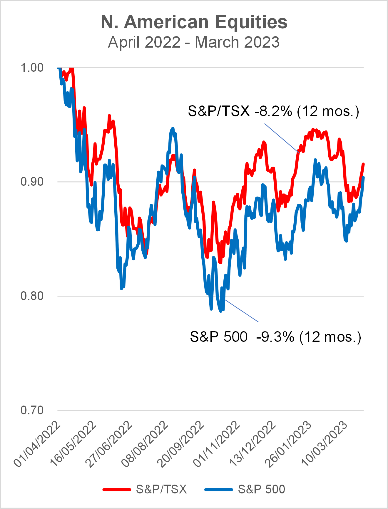 After a challenging 2022, the S&P 500 Index (S&P 500) finished the first quarter of 2023 up 7%. In Canada, the S&P/TSX Composite Index (TSX) gained 3.7% in the same period. The chart below shows the relative return of the S&P 500 and TSX for the 12-month period up to March 31, 2023.