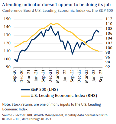 The Conference Board’s Leading Economic Index posted its 17th successive monthly decline, even though the broad stock market has rallied over the last 11 months. In our view, the apparent disconnect between these two typically correlated data series suggests equity investors appear to be ignoring the dislocations caused by a tightening Fed.