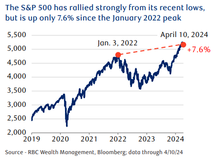 The S&P 500 has surged 25.3 percent since the October 2023 low. The 22.5 percent rally in Q4 of 2023 and Q1 of this year ranks among the top five percent of the strongest six-month moves in the last 75 years, according to data compiled by Bloomberg Intelligence. But in the context of the last couple years, the picture is less buoyant, as the chart below shows. The S&P 500 is up only 7.6 percent since the January 2022 peak.