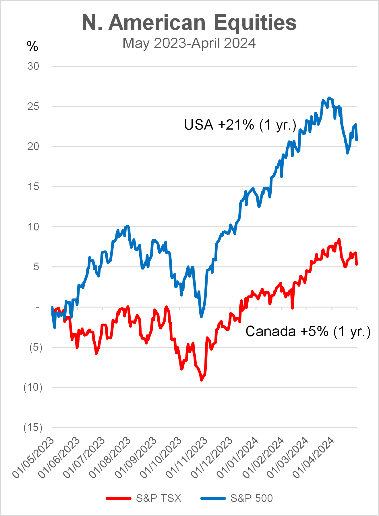 The S&P/TSX Composite Index (TSX) traded mostly in positive territory in early 2024, and was up 3.5% by April 30th (see red line in chart below) The S&P 500 Index (S&P 500) rallied in Q1, setting a record high before settling up 5.3% at the end of April – see the blue line in the chart below.