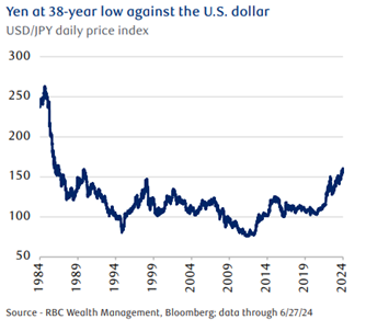 The yen fell to a 38-year low of 160.87 against the U.S. dollar, well beyond the level in April when officials intervened. Japan’s Vice Minister of Finance for International Affairs Masato Kanda reiterated that authorities are urgently watching the foreign exchange markets and would take appropriate steps as needed.