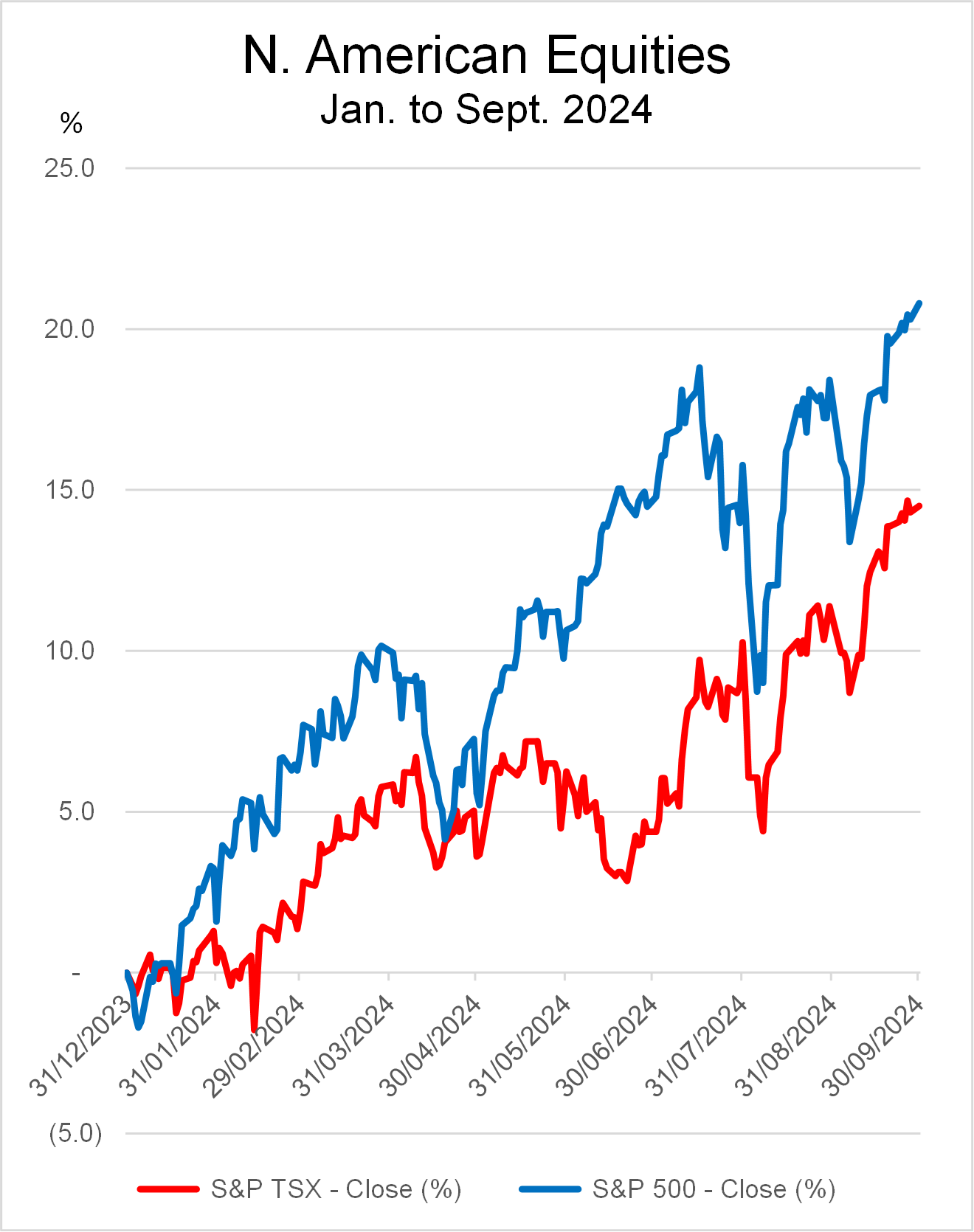 The U.S. stock market as measured by the S&P 500 Index finished up 20.3% for the first nine months of the year. After a brief wobble in July and August it regained its upward trajectory and set new highs. Similarly, the S&P/TSX Composite Index (TSX) for Canada was up 14.3% during the same period, also setting new highs.