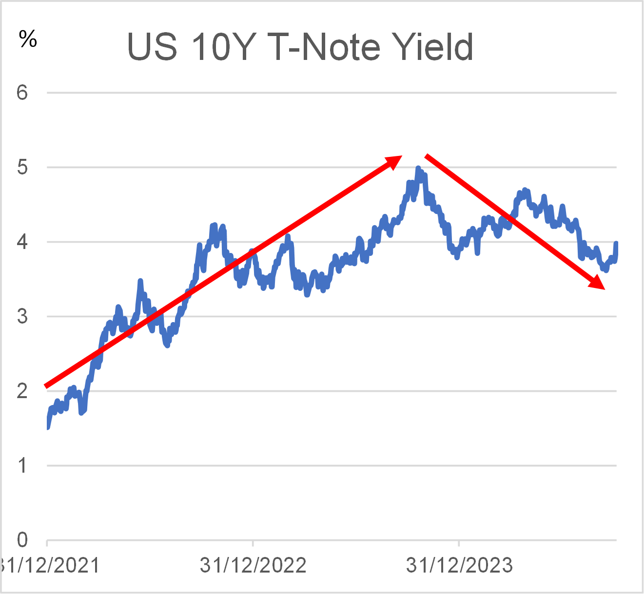The above chart shows the 10-year U.S. government bond yield climbing steeply in 2022 reaching a peak just under 5% in 2023. This was in line with the Fed policy rate increase. Bond yields have since started to recede as the market anticipated future rate cuts.