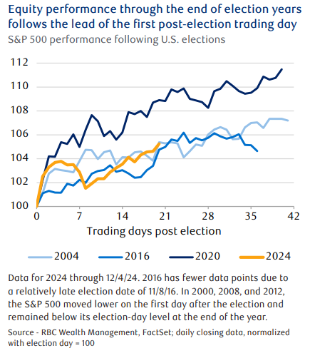 Stocks rallied on the first post-election trading day in 2020, 2016, and 2004 and continued to move higher through the final trading day of the year. In contrast, stocks moved lower the day after the 2012, 2008, and 2000 elections and remained below the election-day levels through year’s end. This suggests 2024 may also see a strong finish for stocks if history repeats.