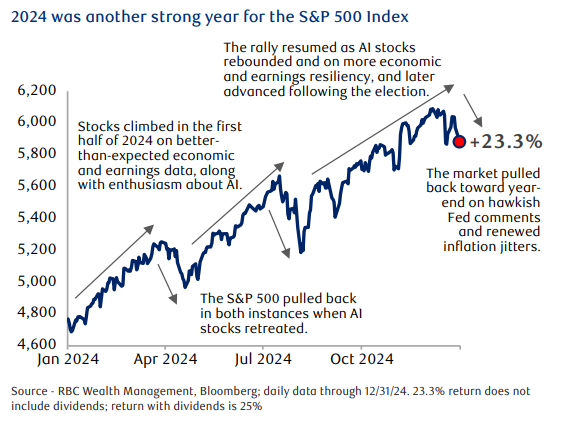 2024 was a positive year for Canada and U.S. stock markets with the TSX up 18% and the S&P 500 up 23%. The technology heavy Nasdaq advanced 28.6%.