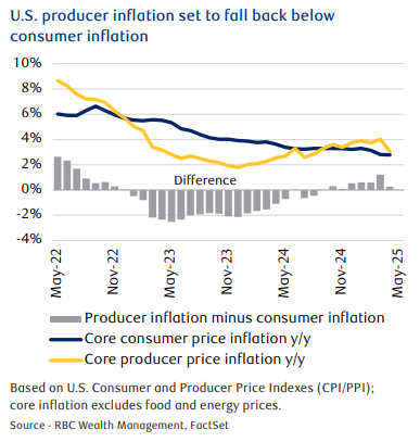 - The economic data highlights during the week were the monthly U.S. inflation readings. Both consumer inflation and producer inflation came in lower than expected in April, confounding analysts who had expected tariff hikes to spur higher prices.