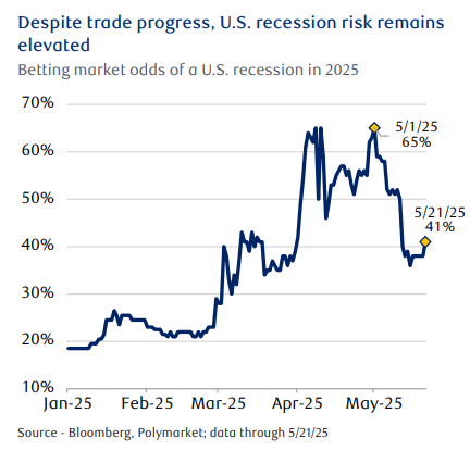 • Despite early signs of trade progress, recession risk for the United States remains elevated. According to Polymarket, the world’s largest prediction market, the odds of a U.S. recession in 2025 peaked at 65% in early May but have since moved notably lower after President Trump announced a trade deal with the United Kingdom and paused reciprocal tariffs on China for 90 days.