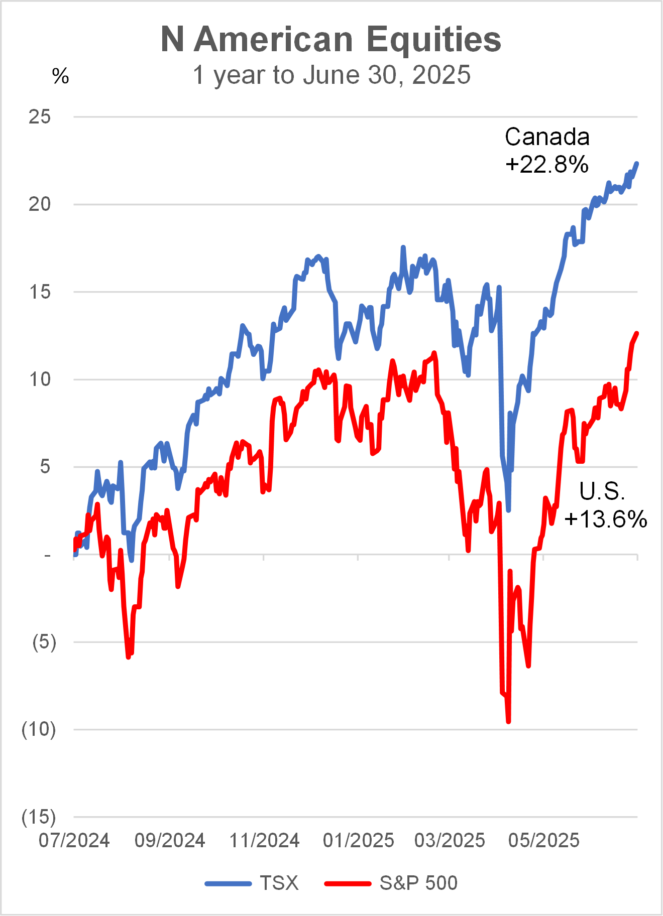 To describe the stock markets in Canada and the U.S. in the first six months of 2025 as volatile would be an understatement. The S&P/TSX Composite Index (TSX) was up 8.6% in the first half of the year, and up 22.8% in the past 12 months to June 30 (see blue line in chart below). The S&P 500 Index in the U.S. was up 5.5% in the first half of 2025, and gained 13.6% in the 12 months to June 30. In the past year the Canadian stock market has led the U.S. market, a reversal of the past decade.