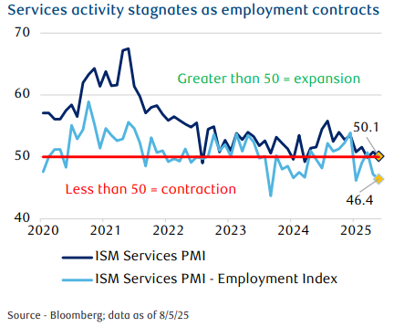 - Momentum in the U.S. economy appears to be fading, with several key indicators flashing warning signs. The July jobs report disappointed, showing just 73,000 non-farm payrolls added—well short of expectations for 115,000. Meanwhile, July’s ISM Services report added to the concern: the U.S. Services Purchasing Managers’ Index slipped to 50.1—barely above contraction.