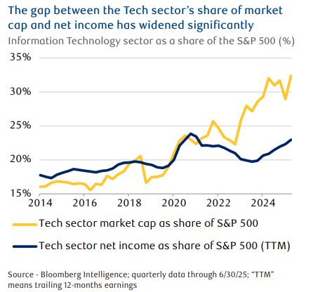 - Since late 2022, the Tech sector’s market capitalization (market value) as a proportion of the S&P 500’s total market cap has expanded meaningfully, from around 22 percent to over 32 percent. Yet at the same time, the Tech sector’s net income (net earnings or net profits) as a proportion of the S&P 500’s total net income hasn’t moved up much. It’s risen from 21 percent in late 2022 to 23 percent recently.