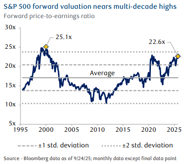 - S&P 500 forward valuation nears its highest levels in over two decades. The S&P 500’s forward price-to-earnings ratio of 22.6x is nearing two standard deviations above its long-term average of 17.1x, reaching levels not seen since the early 2000s tech bubble (excluding the brief COVID-19 pandemic distortion).