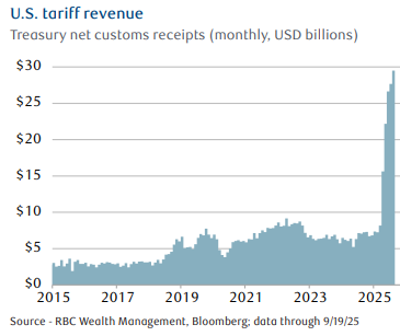 - Collections from U.S. tariffs are surging, but trade diversion and exemptions have softened the macro impact. Even at below-estimated levels, the overall cost of tariffs (import tax) is still substantial. U.S. tariff revenues are now around $30 billion per month, putting collections on an annualized pace of $354 billion—roughly $275 billion more than in 2024.