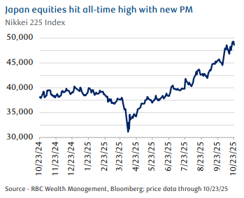 - Sanae Takaichi became Japan’s first female prime minister after winning the parliamentary vote on Tuesday. The new prime minister is known to be a fiscal expansionist and has vowed to do more for households struggling with rising costs. According to Reuters, the new administration has started working on a large stimulus package, likely to exceed last year’s US$92 billion, to help combat inflation.