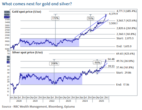 - From our Technical Strategist update on October 23: The chart below reflects the impressive rally in gold (top panel) and silver (bottom panel) that has developed in 2024 and 2025 following broad trading ranges between 2020 and 2024. Concerns regarding a declining U.S. dollar, expanding U.S. deficits, and global central banks accumulating gold have accelerated demand for both of the precious metals, with gold and silver surging 70% and 90%, respectively, in 2025.