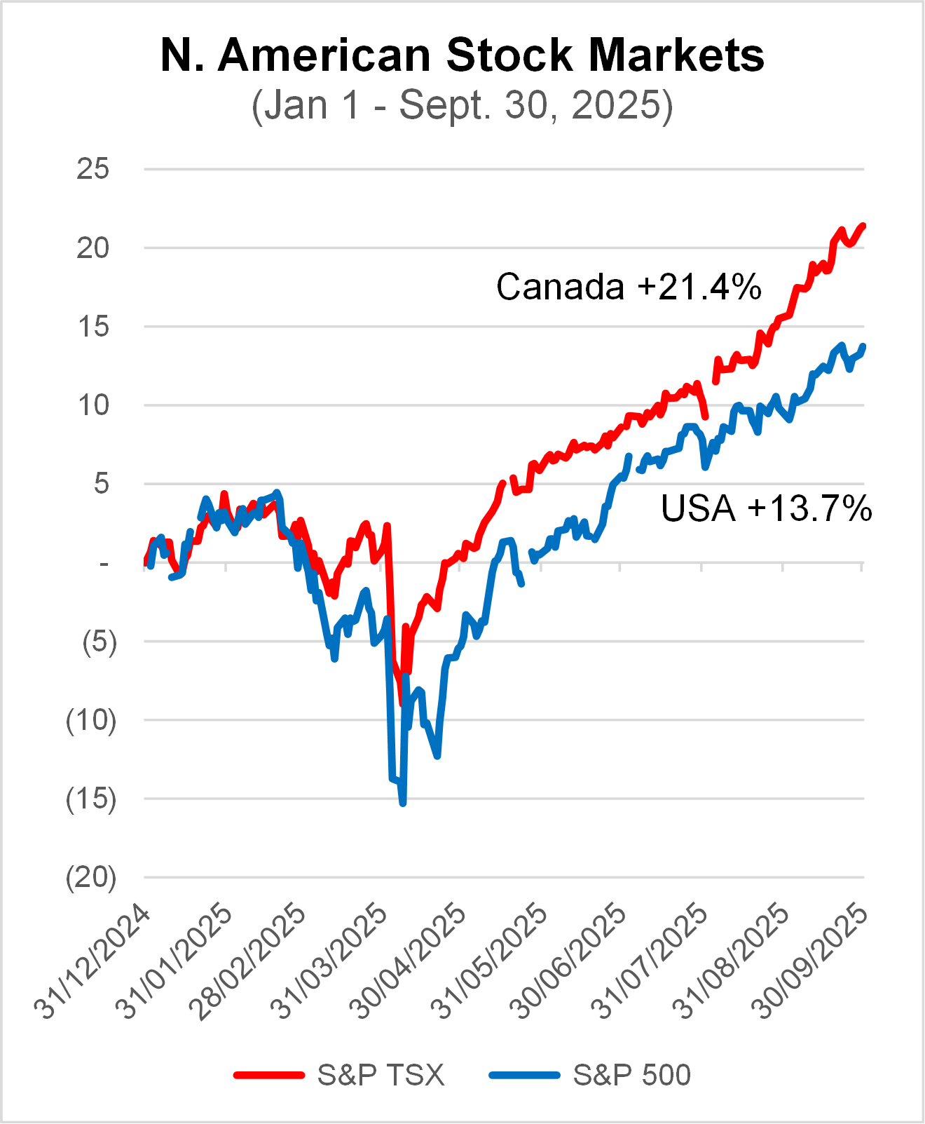 The S&P/TSX Composite Index (TSX) in Canada was up 21.4% in price from the beginning of the year to September 30. The S&P 500 Index (S&P 500) in the U.S. was up 13.7% in the same period.