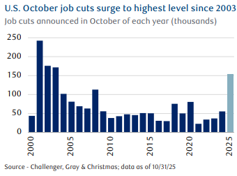 - According to a report by outplacement firm Challenger, Gray & Christmas Friday morning, U.S. companies announced over 150,000 job cuts last month, the most for any October since 2003, as rising costs, softer consumer spending, and the adoption of AI lead more companies to reduce headcount.