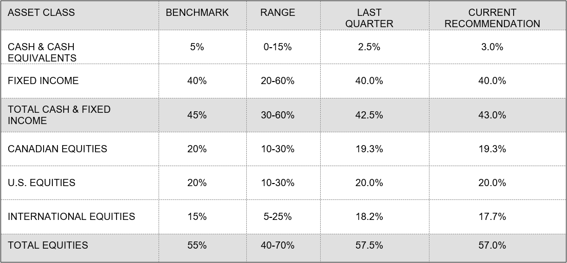 - Our base case is for the economy to continue expanding at a moderate pace but our scenario analysis places a higher-than-normal chance of recession and a bearish outcome for risk assets. We also recognize that bond yields are extremely low and that prospective returns in fixed income are quite unattractive. Equities continue to offer superior total-return potential versus bonds over the longer term and we continue to favour stocks over bonds in our asset mix. Recession odds are now higher than they have been at earlier points in the cycle, so we feel it is appropriate to move further along the path of de-risking our portfolios that we have been following as the cycle has matured. We lowered our equity weight by half a percentage point this quarter, placing the proceeds to cash. Our current recommended asset mix for a global balanced investor is 57.0% equities (strategic: “neutral”: 55%), 40.0% bonds (strategic “neutral”: 43%) and 3.0% in cash.