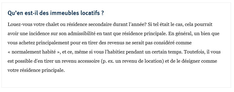 Pour qu’un bien soit admissible, vous devez en être le propriétaire (unique ou conjointement avec d’autres propriétaires), et vous ou votre conjoint, ex-conjoint ou enfant devrez l’avoir « normalement habité » durant une partie de l’année. Lorsqu’il s’agit de considérer ce qu’on entend par « normalement habité », l’Agence du revenu du Canada (ARC) a stipulé que ses exigences pourraient être satisfaites même si le propriétaire, son conjoint ou ses enfants ne l’habitaient que pendant une brève période. De façon plus particulière, dans le cas de propriétaires de chalets ou d’habitations saisonnières, cela signifie que même si vous ne l’habitiez qu’à l’occasion de brèves vacances, vous pourriez être considéré comme l’ayant « normalement habité » pendant l’année.
