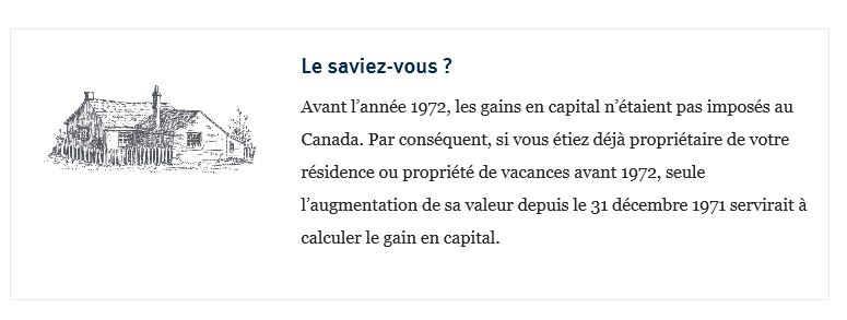 En 1994, le gouvernement a supprimé l’exonération pour gains en capital qui se chiffrait alors à 100 000 $, mais vous permettait de faire un choix fiscal unique sur votre déclaration de revenus pour l’année 1994, afin de demander cette exemption et de l’appliquer à tout gain en capital accumulé à cette date. Si vous aviez fait ce choix fiscal et que vous étiez toujours propriétaire de cette résidence aujourd’hui, assurez-vous de considérer le prix de base révisé au moment de sa vente (ou de sa cession).