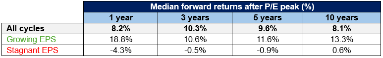 - The bulk of the positive performance has come in instances where P/Es peaked but earnings growth continued.