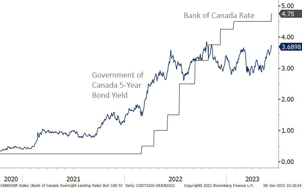 As seen above, 5-year bonds yields have accelerated in recent weeks as economic data pointed to economic resilience, with the Bank of Canada followed up on with this week’s rate hike. In the short term, these higher bond yields put pressure on bond prices, though we would note that the 5-year Government of Canada yield has been in a wide trading range since mid-2022. With yields now near their cyclical highs, savers are getting yet another opportunity to put excess cash to work in the bond market at yields unseen in over a decade.