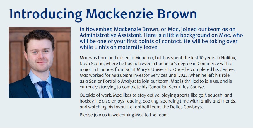 Our esteemed Administrative Assistants, Linh and James Tran-MacDonald, are expecting a new addition to their family! As Linh prepares for maternity leave at the end of February, we’re pleased to introduce Mackenzie Brown, who will be stepping in seamlessly to support our wealth management team during this exciting time.