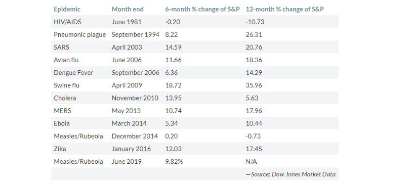 I have researched other health events including HIV, SARS, and the Swine flu, and I found that, while these past events had also weighed on global stock markets, we typically saw a full recovery - and even growth - within six months of the end of the epidemic. I have included a table showcasing how the S&P 500 index has been impacted by 12 comparable events.